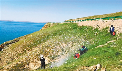 生態(tài)管護員在鄂陵湖邊清理垃圾。