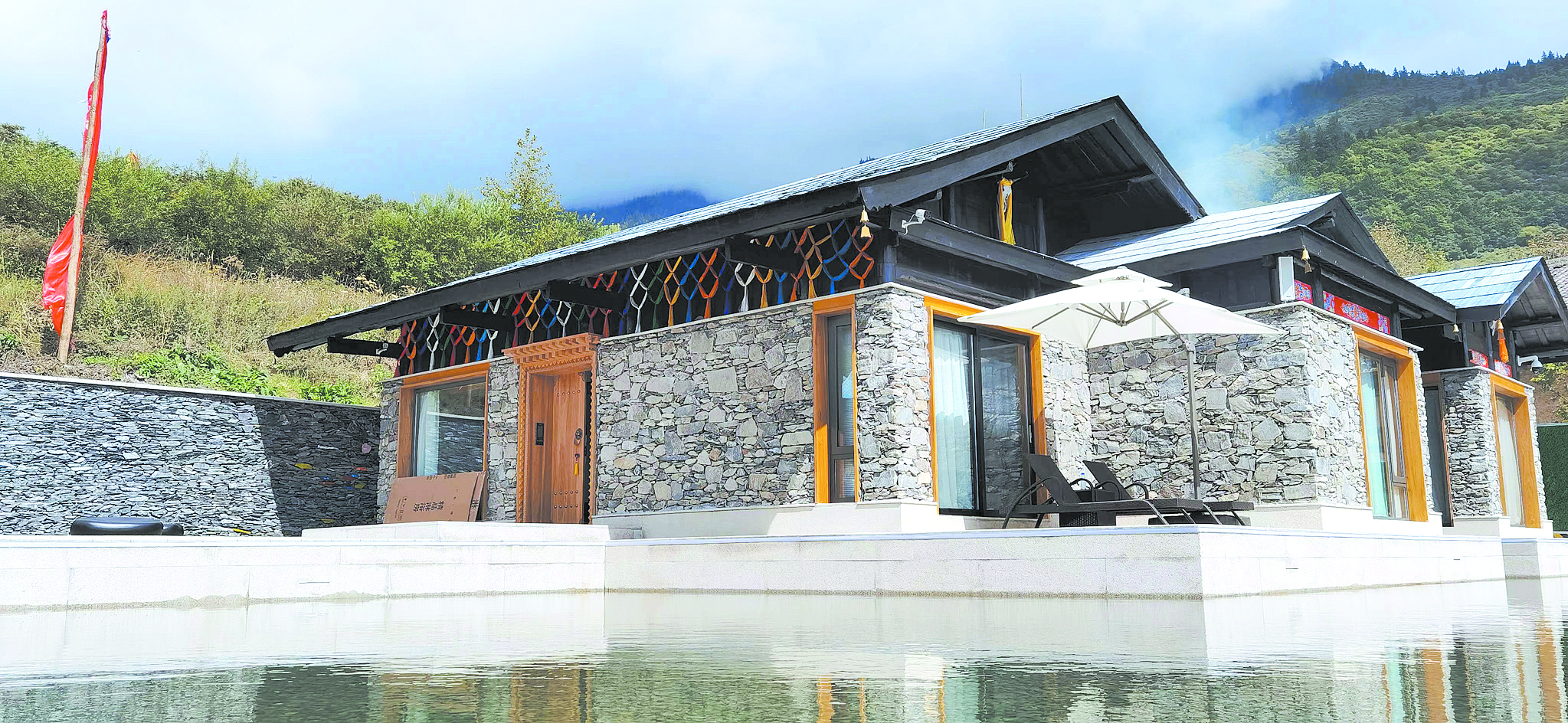 圖片的拍攝地點(diǎn)是四川省阿壩藏族羌族自治州九寨溝縣漳扎鎮(zhèn)上四寨村,圖中現(xiàn)代氣息的落地窗與毛石砌墻木瓦覆頂,藏式文化元素結(jié)合的建筑,是邛崍市第五批對(duì)口支援工作隊(duì)結(jié)合漳扎鎮(zhèn)國(guó)際魅力生態(tài)小鎮(zhèn)建設(shè),引入邛崍市資深文旅企業(yè),在九寨溝縣落地的“首秀”。