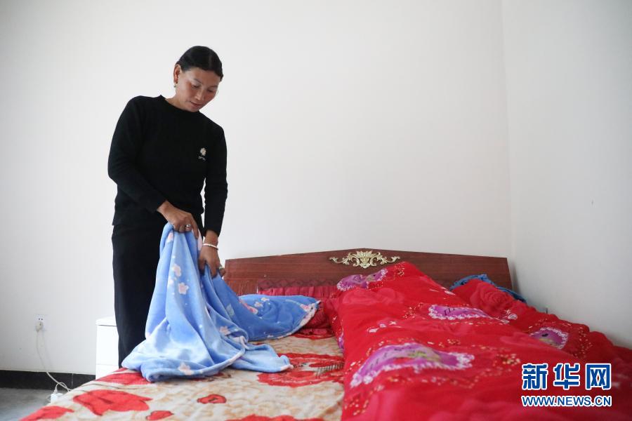 12月2日,在舟曲縣曲告納鎮(zhèn)田園生態(tài)小區(qū)易地扶貧搬遷集中安置點(diǎn),曲告納鎮(zhèn)茶坪村扎尕組村民在臨時(shí)安置的房屋內(nèi)疊被子。新華社記者 馬希平 攝