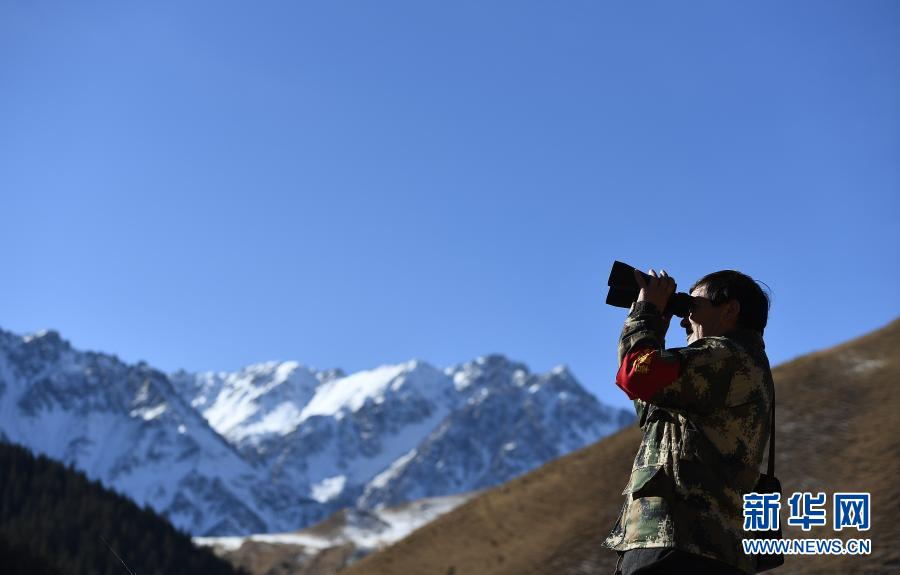 12月8日,祁連山國家公園扎麻什管護站生態(tài)管護員周曲才郎巡查途中使用望遠(yuǎn)鏡。新華社記者 張宏祥 攝