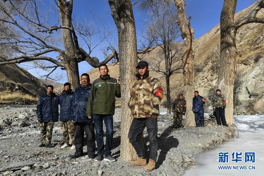 12月8日,祁連山國家公園扎麻什管護站工作人員郝生寶、昂旦才讓、索安東周、楊國林、索安拉什旦、昂毛什加、多杰昂秀、周曲才郎在巡護途中合影(從左至右)。新華社記者 張宏祥 攝