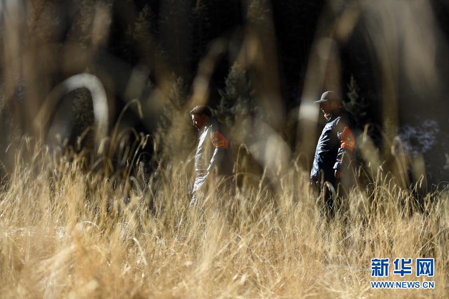 12月8日,祁連山國家公園扎麻什管護站生態(tài)管護員昂毛什加(前)和同伴在巡護途中。新華社記者 張宏祥 攝