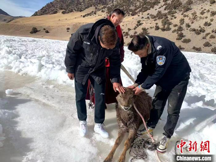 圖為生態(tài)保護人員營救出一只白唇鹿。長江源園區(qū)曲麻萊管理處 供圖