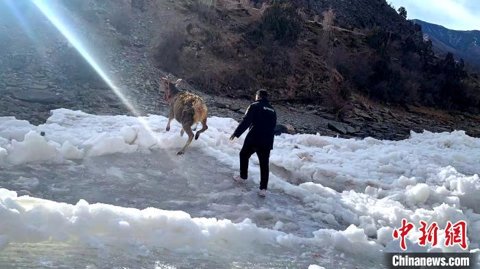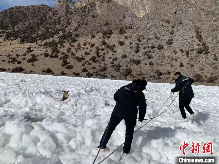 青海生態(tài)保護人員營救被困長江源冰面一級保護動物白唇鹿