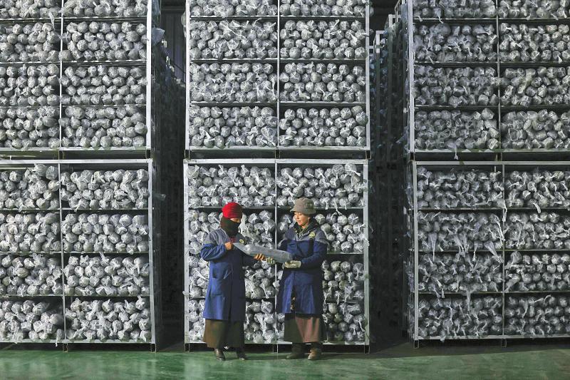 1月4日,松茸產(chǎn)業(yè)園的管理人員在倉(cāng)庫(kù)里整理即將發(fā)放給當(dāng)?shù)胤N植戶的滑子菇菌包。尹鋼 攝