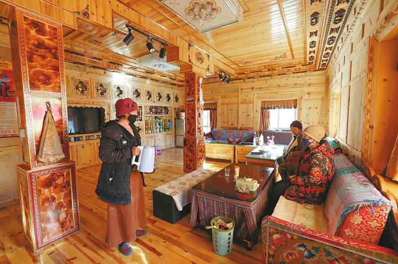 八角樓鄉(xiāng)帕姆林村的白馬翁姆(左)是產(chǎn)業(yè)園的接種工,每月收入4000元。1月5日,她在新家客廳接待外地來(lái)的客人。尹鋼 攝