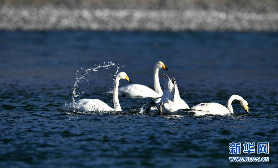1月22日,大天鵝在青海省貴德縣境內(nèi)的黃河中覓食。新華社記者 張宏祥 攝