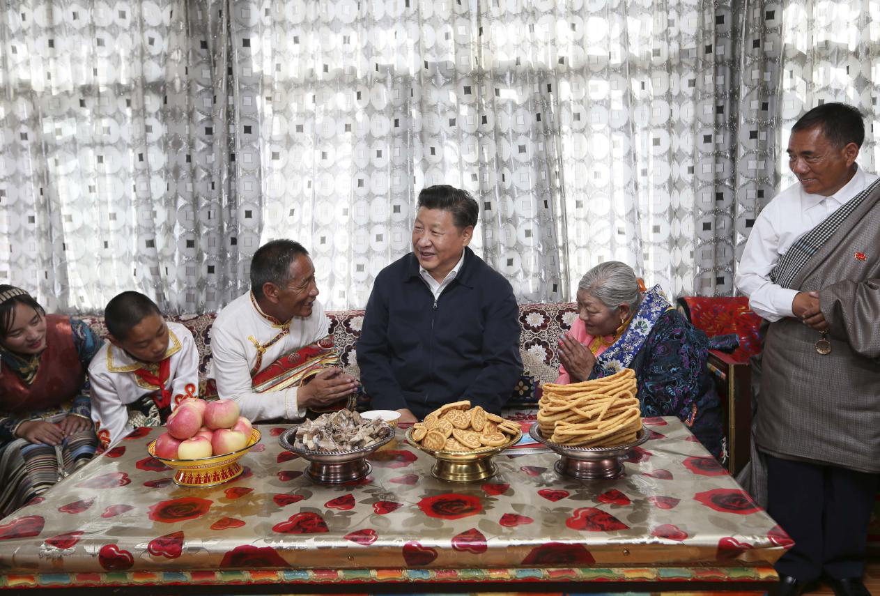 2016年8月22日,習(xí)近平總書記在青海省海西蒙古族藏族自治州格爾木市唐古拉山鎮(zhèn)長江源村藏族村民申格家中同一家人親切交談。
