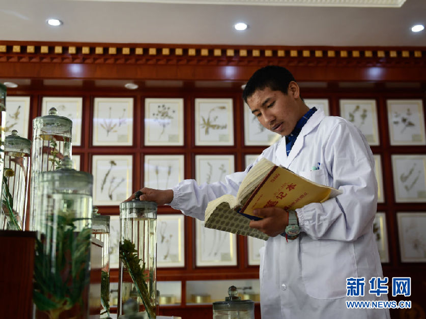 3月16日,在果洛藏族自治州職業(yè)技術(shù)學(xué)校,2020級藏醫(yī)醫(yī)療與藏藥專業(yè)學(xué)生德欽多杰在草藥標本館內(nèi)辨認藥材。新華社記者 張龍 攝