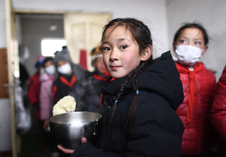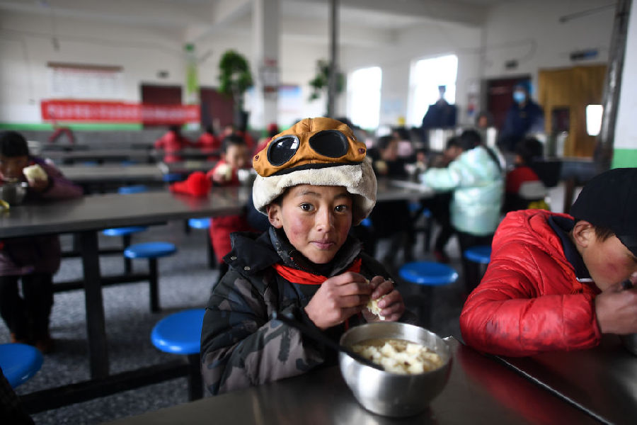 3月16日,在索加鄉(xiāng)寄宿小學(xué)食堂,格來(lái)達(dá)杰(前)在吃晚餐。新華社記者 韓方方 攝