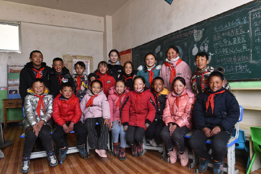 3月16日,在索加鄉(xiāng)寄宿小學(xué),查日老師(后排中)和學(xué)生在一起。新華社記者 駱曉飛 攝