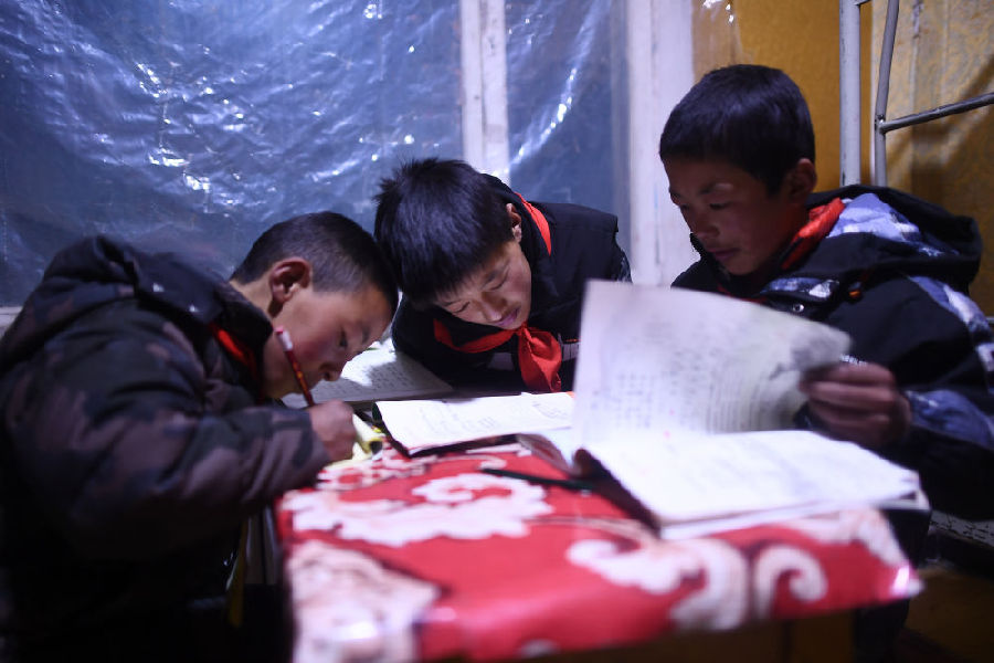 3月16日,在索加鄉(xiāng)寄宿小學(xué),羅松東?。ㄖ校┖托』锇樵谒奚醿?nèi)溫習(xí)功課。新華社記者 張宏祥 攝