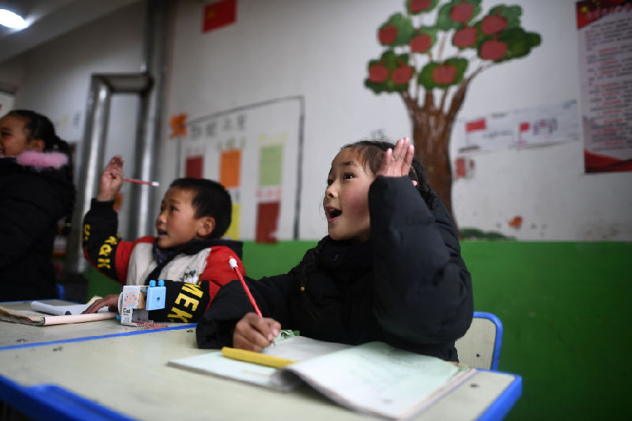 3月16日,索加鄉(xiāng)寄宿小學(xué)學(xué)生白瑪措毛(右)在藏語(yǔ)文課上舉手回答問(wèn)題。新華社記者 張宏祥 攝