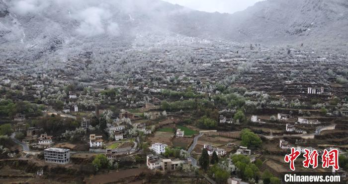 山坡上一幢幢藏式樓房灑落在梨花、綠樹叢中美如畫。劉忠俊 攝