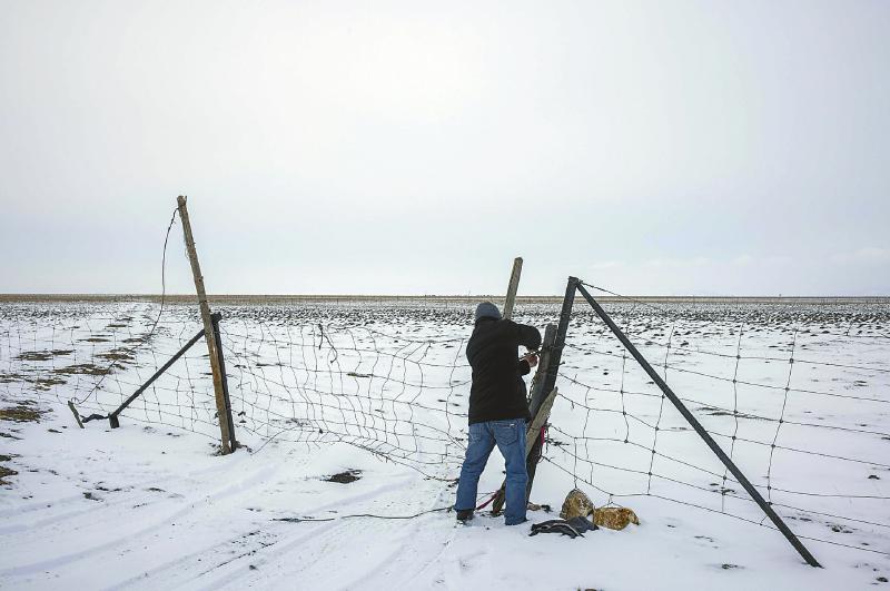 3月6日,若爾蓋濕地國家級自然保護(hù)區(qū)管理局生態(tài)護(hù)濕員如科冒雪清理棲息地周邊的隱患。尹鋼 攝