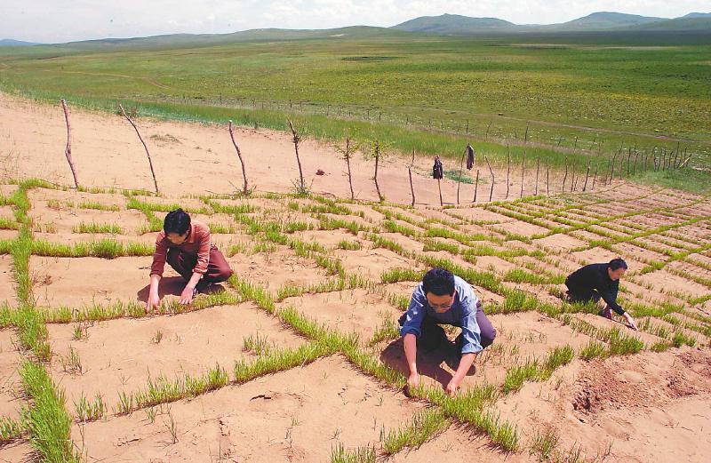 2007年4月8日,當(dāng)?shù)厝罕娫谌魻柹w縣麥溪鄉(xiāng)和轄曼鎮(zhèn)實施防沙治沙項目。尹鋼 攝