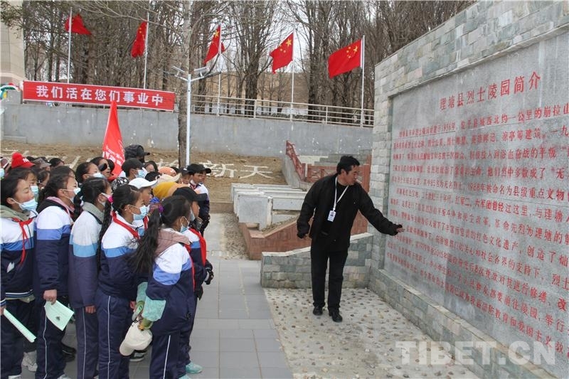 圖為洛絨志麥為學生介紹烈士陵園情況 攝影:葉強平