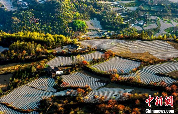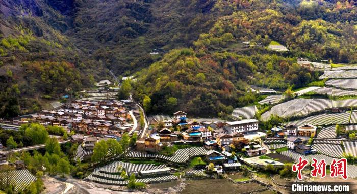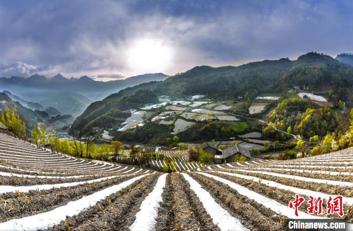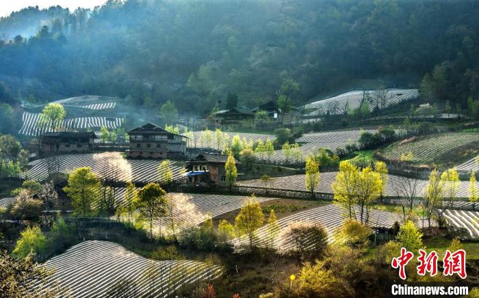 4月的四川雅安市寶興縣磽磧藏族鄉(xiāng),山坡上整齊有序的地膜,錯落有致鋪在藏寨林間,構(gòu)成了一幅田園山水與天人合一的自然畫卷。
