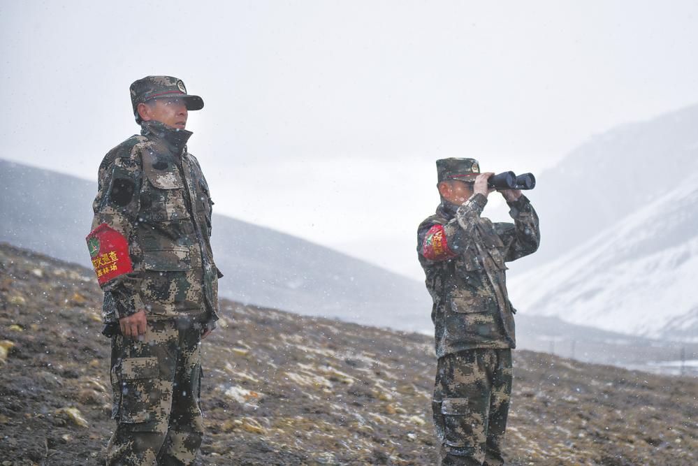 4月23日,祁連山國家公園沙龍灘管護(hù)站生態(tài)管護(hù)員羅藏次成(右)在巡護(hù)途中使用望遠(yuǎn)鏡監(jiān)測野生動(dòng)物。新華社 吳剛 攝