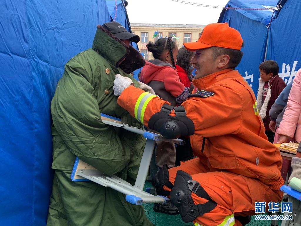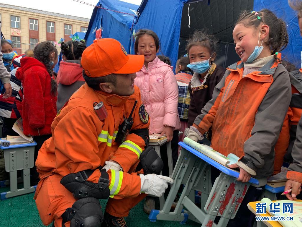 22日,地震發(fā)生后,群英尕丁來到安置區(qū)搭建帳篷和消防排查,12歲的班瑪華桑就與身穿橙色制服的群英尕丁結(jié)下了兄弟情誼?!拔覀兪且惠呑拥男值埽@幾天你也要照顧好自己?!比河㈡囟⌒χ鴩诟腊喱斎A桑。