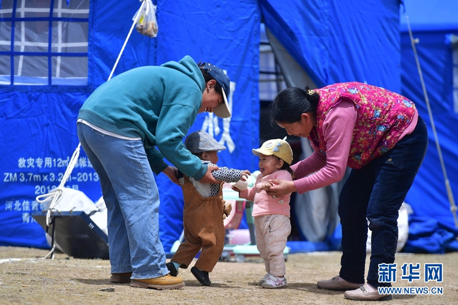 5月26日,三名小朋友在瑪多縣瑪查理鎮(zhèn)安置點內(nèi)玩耍。