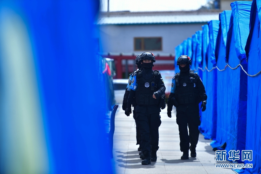 5月26日,果洛州公安局特警支隊的特警在瑪多縣縣政府廣場臨時安置點內(nèi)巡邏。