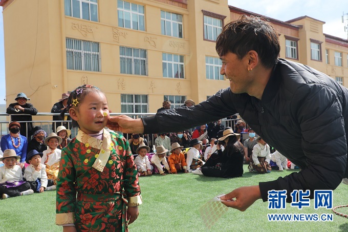 今年的“六一”活動上,貢巴幼兒園的小朋友們表演了藏族歌舞、《三字經》朗誦等精彩節(jié)目。小男孩們穿上藏袍、戴上氈帽,活潑地跳起鍋莊。小女孩們盛裝打扮,頭上用彩色頭繩編滿了小辮兒,腰間特色銀飾叮當作響。親子互動游戲笑聲不斷,欄桿外的老阿媽看得興致盎然。