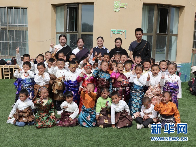 貢巴幼兒園師生合影。新華社記者 張玉潔 攝