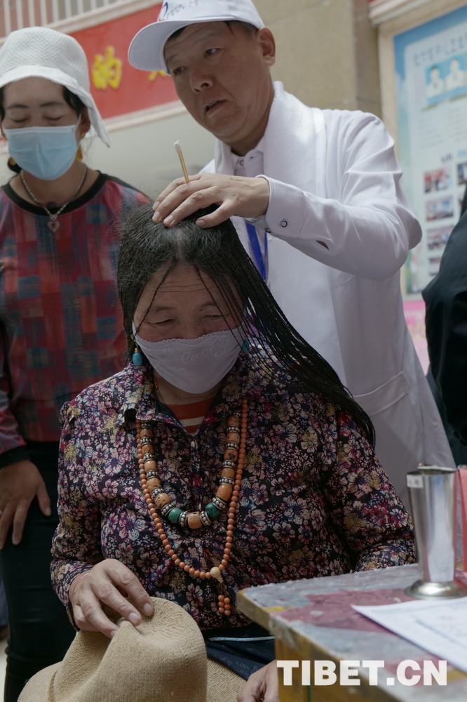 一位就診的女患者右腿小腿部滿凹凸不平,趙臣來(lái)在她的小腿上、頭部后側(cè)扎了針,并讓她走幾步看看,“這是骨關(guān)節(jié)炎,您平時(shí)注意不要受風(fēng)著涼,坐的時(shí)間別太長(zhǎng),可以坐得稍高一點(diǎn),也不要深蹲……我再給您開些藥吧?!辈灰粫?huì)兒,這位女士說(shuō)稍有緩解,不禁連連稱謝:“瓜珍切”(藏語(yǔ)“謝謝”)。這真是太神了!