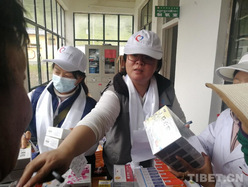 圖為陳思音(右)在果洛州義診時(shí)為當(dāng)?shù)厝罕姺职l(fā)藥品