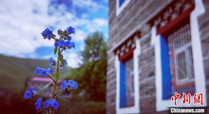 藏式民居旁盛開的小藍(lán)花。劉忠俊 攝