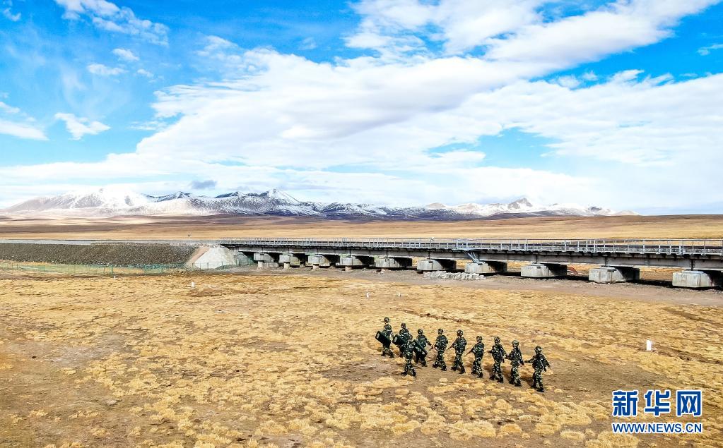 武警青海總隊執(zhí)勤支隊執(zhí)勤七中隊官兵在青藏鐵路沿線巡邏(5月21日攝)。新華社 楊浩 攝