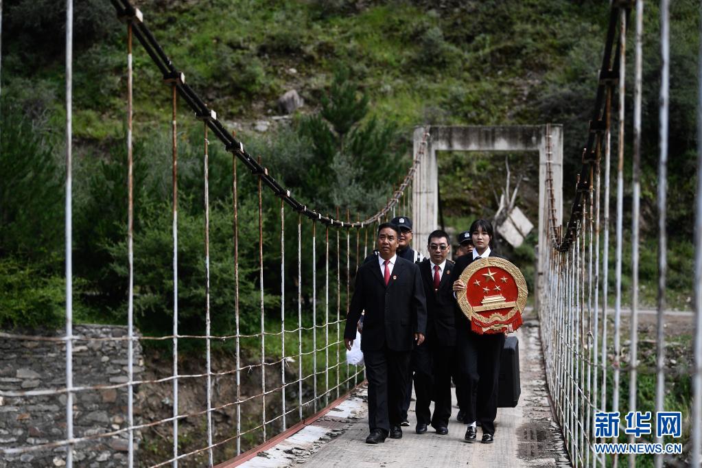8月7日,班瑪縣人民法院巡回法庭成員前往班瑪縣燈塔鄉(xiāng)班前村提供法律服務。新華社記者 張龍 攝
