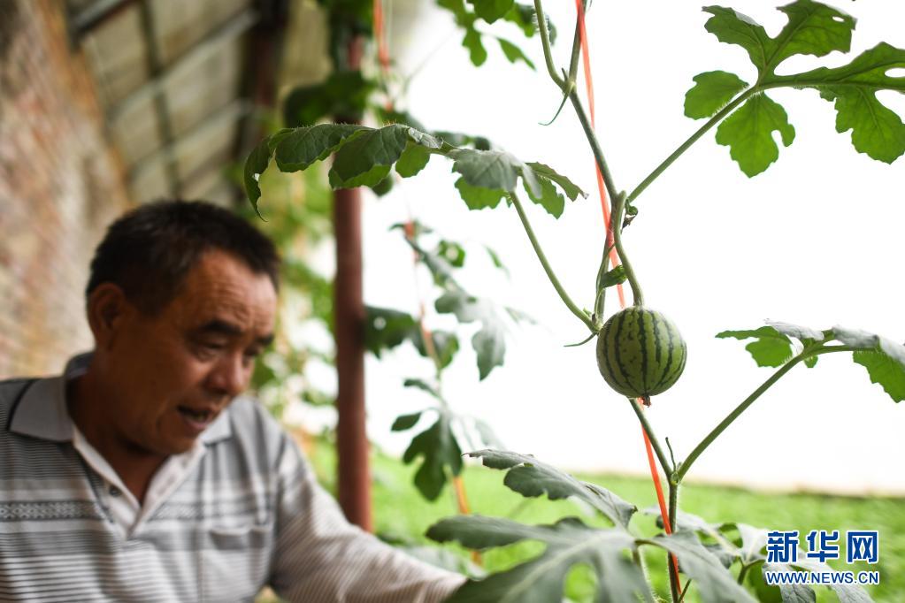 8月5日,魏金明在玉樹市結(jié)古鎮(zhèn)新寨村的蔬菜基地查看西瓜長勢。新華社記者 吳剛 攝