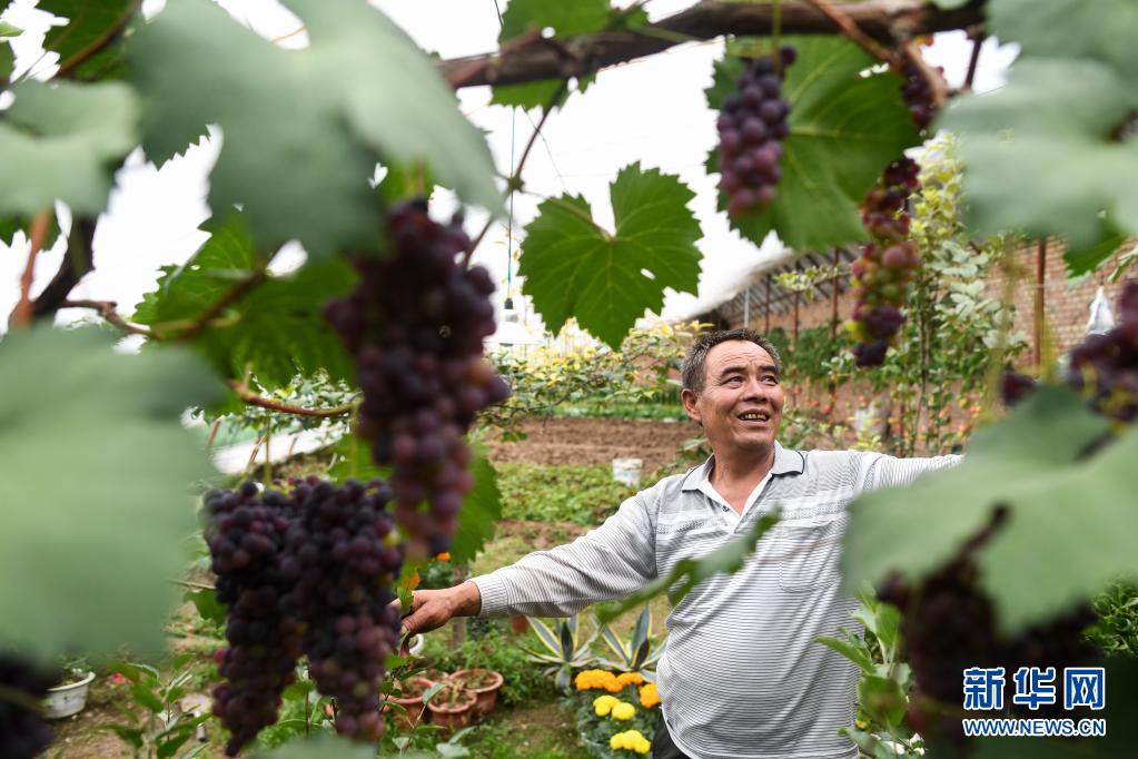 8月5日,魏金明在玉樹市結(jié)古鎮(zhèn)新寨村的蔬菜基地整理葡萄架。新華社記者 吳剛 攝