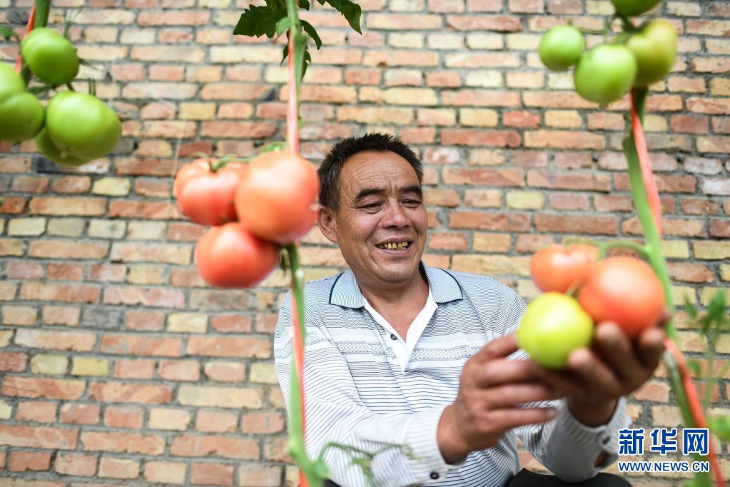 8月5日,魏金明在玉樹市結(jié)古鎮(zhèn)新寨村的蔬菜基地查看西紅柿長勢。新華社記者 吳剛 攝