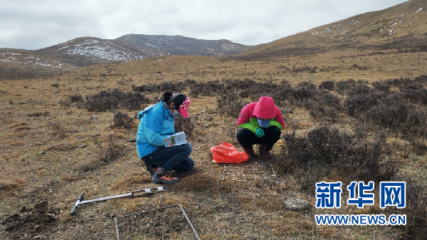 郭娜(右)和同學在進行春季牧場的植被調(diào)查。(受訪者供圖)