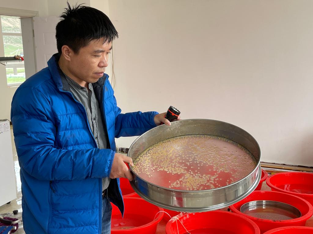 李偉正在查看孵化中的長(zhǎng)江源關(guān)鍵魚(yú)類受精卵(6月23日攝)。