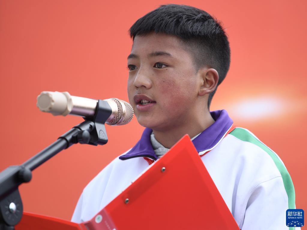 9月1日,在位于果洛藏族自治州瑪沁縣的瑪多地震災(zāi)后過渡安置一校區(qū),學(xué)生科熱在國(guó)旗下講話。新華社記者 張龍 攝