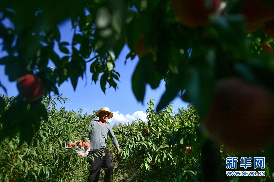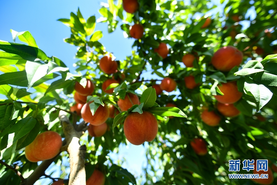 朱聯(lián)產(chǎn)承包的果園內(nèi),成熟的桃子掛滿(mǎn)枝頭。新華網(wǎng) 潘彬彬 攝