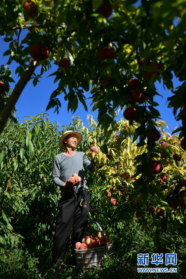 朱聯(lián)產(chǎn)在果園內(nèi)采摘桃子。新華網(wǎng) 潘彬彬 攝