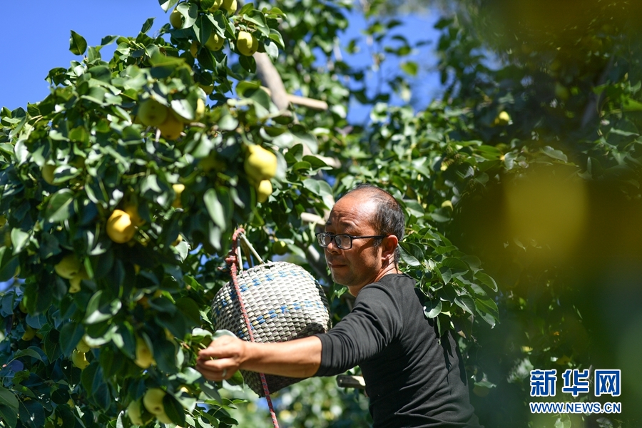 9月23日,貴德縣河?xùn)|鄉(xiāng)下羅家村村民楊林春在自家的農(nóng)家院采摘長(zhǎng)把梨。新華網(wǎng) 潘彬彬 攝