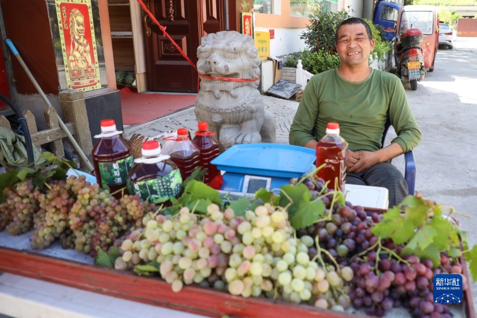 9月7日,在舟曲縣大川鎮(zhèn)土橋子村,村民擺攤售賣自家采摘的葡萄。新華社記者 馬希平 攝