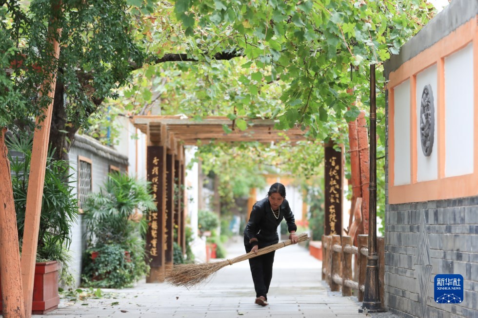 10月13日,在舟曲縣大川鎮(zhèn)土橋子村,村民打掃自家門前落葉。新華社記者 馬希平 攝