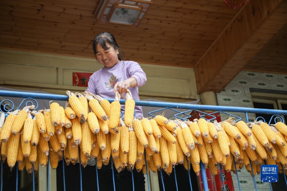 10月13日,舟曲縣大川鎮(zhèn)土橋子村村民在家中翻曬玉米。新華社記者 馬希平 攝