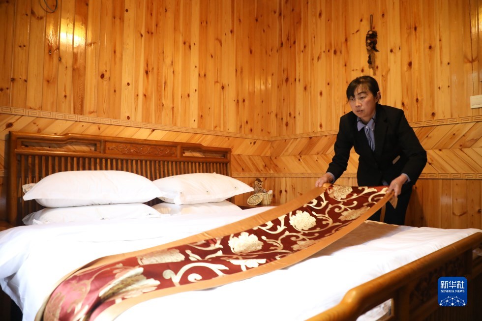 10月13日,服務(wù)員在舟曲縣巴藏鎮(zhèn)前北山村各皂壩生態(tài)園的民宿里整理床鋪。新華社記者 馬希平 攝