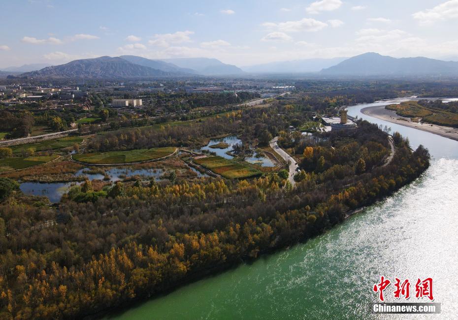 10月16日,航拍青海省海南藏族自治州貴德縣黃河岸邊的蘆花灣水生態(tài)公園。(無(wú)人機(jī)照片) 中新社記者 馬銘言 攝