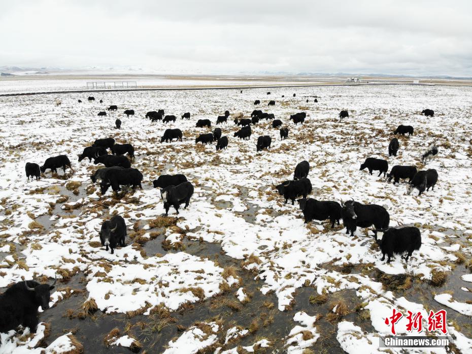 成群牦牛在白雪覆蓋的草原上食草。張浪 攝