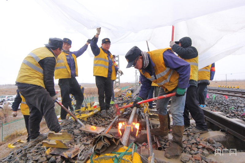 但這還不夠,為了讓鋼軌充分舒放“筋骨”、釋放應(yīng)力,職工們還必須切開鋼軌,緊接著進(jìn)行焊聯(lián),這項工作由德令哈重點維修車間負(fù)責(zé)。車間主任郭鋒亮一邊組織職工開動切割機(jī)實施精準(zhǔn)切割,一邊組織職工架起焊鍋?;鸹w舞,火苗竄升,作業(yè)人員的對比服在火光和風(fēng)雪的映襯下顯得更加熠熠生輝。最終,做完“伸展運動”的鋼軌在焊劑的作用下重新融合在了一起,經(jīng)打磨后再難區(qū)分彼此。