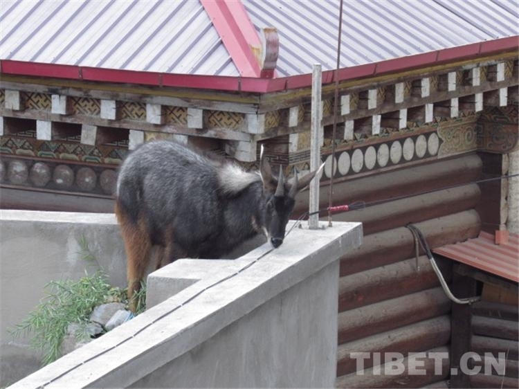 除了寄養(yǎng)在根秋澤仁家的雪豹,目前真達(dá)鄉(xiāng)還救助了一只不滿周歲的白唇鹿,寄養(yǎng)在護林員多加家里。祝修濤介紹,今年5月中旬,護林員在巡山的時候發(fā)現(xiàn)了這只白唇鹿,“當(dāng)時它才剛剛能走,它的母親不知去向。隊員們就把它救助回來,用牦牛奶喂養(yǎng)長大,現(xiàn)在它可以吃青稞了。等它再長大一些,我們會把它放歸山林?!?/p>
